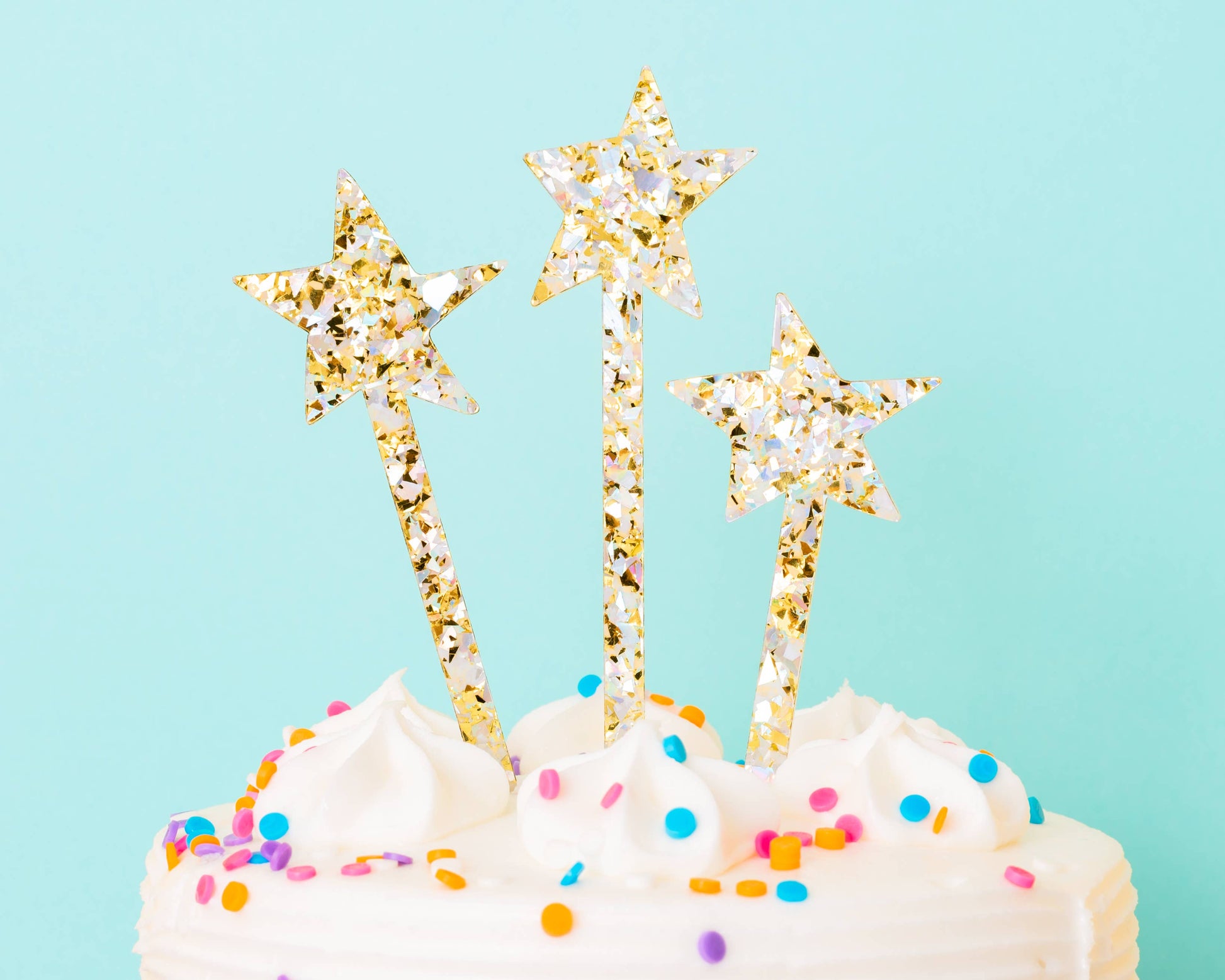 Add a little confetti, and a lot of sparkle, to your store with our oversized confetti cake toppers. These cake toppers are perfect to top cakes, cupcakes, donuts and more. They also make great floral arrangement and party decor. Each topper is handmade which means no two will be exactly alike. Perfect for birthdays, anniversaries, Sweet 16, Quinceanera and more!