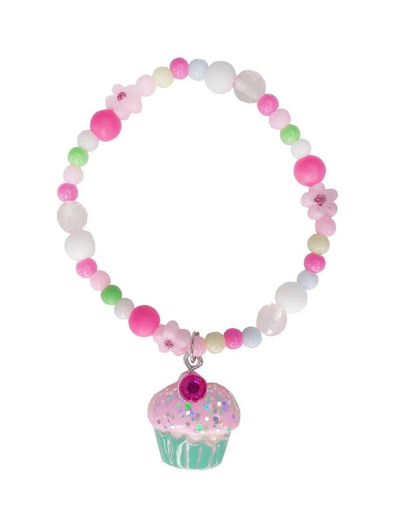 Who doesn't love a good cupcake? Adorable cupcake (stretch) bracelet with pastel and flower beads, adorned with gems, and a glittery cupcake pendant.