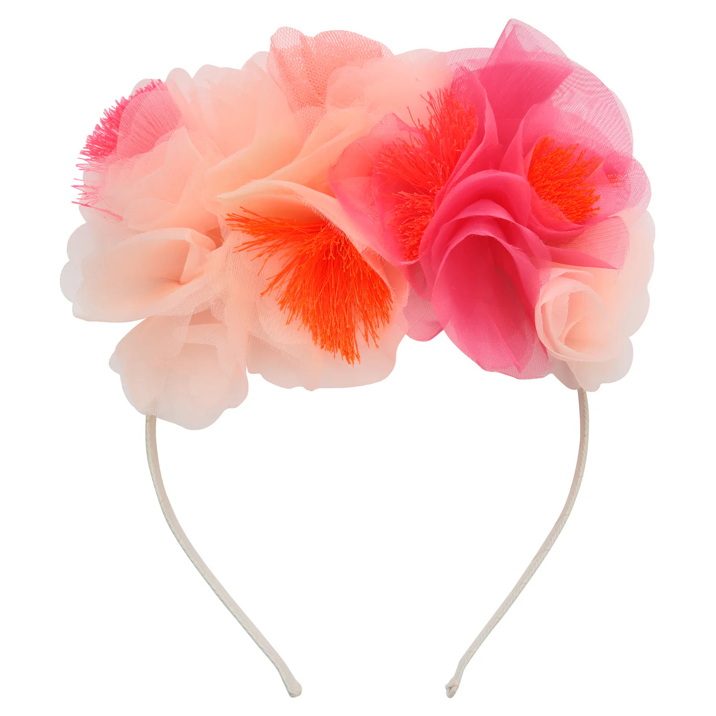 This gorgeous floral headband will give any hairstyle a stylish look in seconds. Made with beautiful bright organdie flowers.