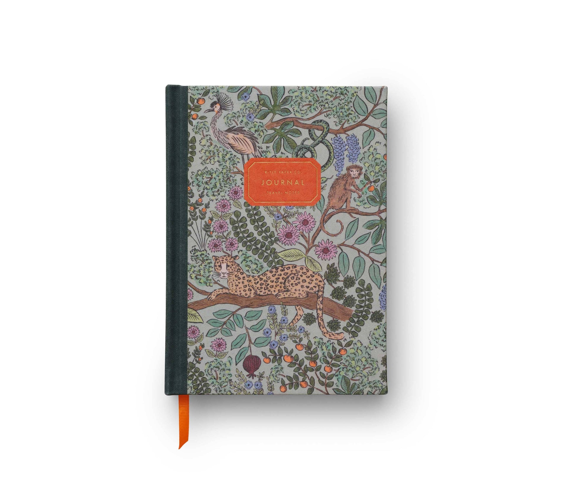 A guided hardcover journal wrapped in bookcloth featuring an illustrated print inspired by old world travel. Inside find sections for dream travel destinations, sights to see, activities to do, places to eat, hotels to visit, and travel log pages, plus a grosgrain ribbon bookmark.